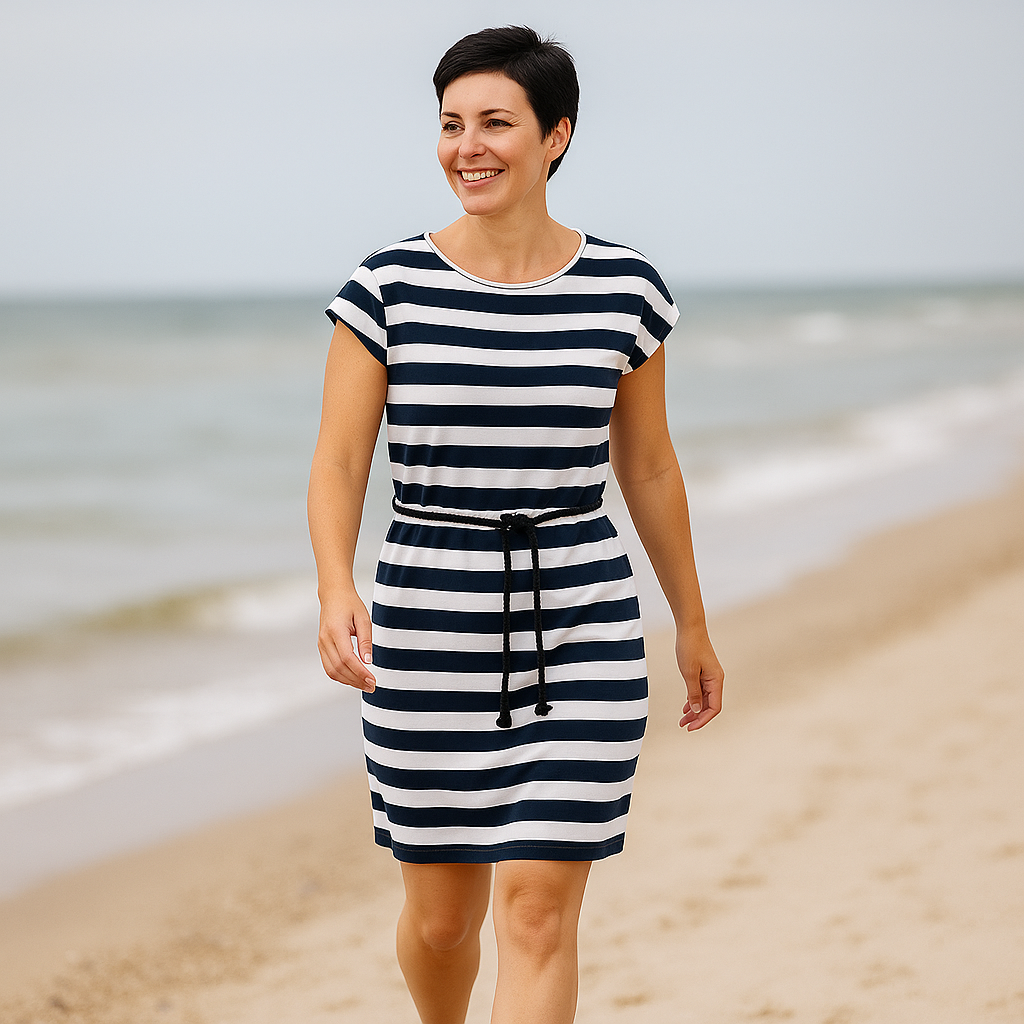 Erleben Sie maritimen Flair mit unserem Damen-Kleid im Blockstreifen-Design, das Eleganz und Tragekomfort geschickt kombiniert.