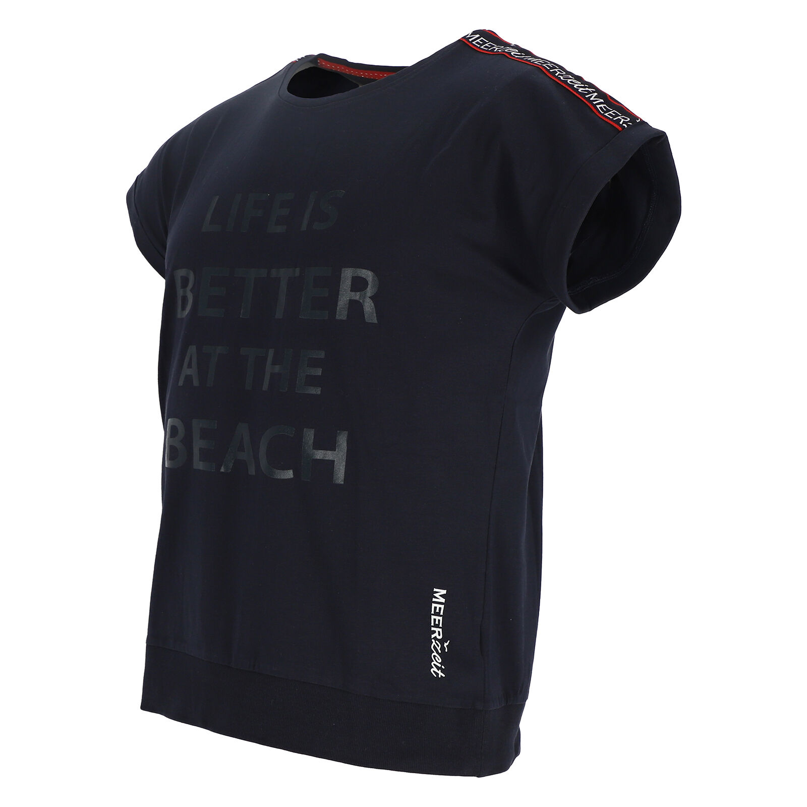 Dieses dunkelblaue T-Shirt überzeugt mit einem lässigen Schnitt und dem stylischen Front-Print „Life is better at the beach“. Die umgeschlagenen Ärmel, das dezente Branding an der Schulter sowie das breite Bündchen am Saum sorgen für einen sportlich-modernen Look – perfekt für entspannte Sommertage!