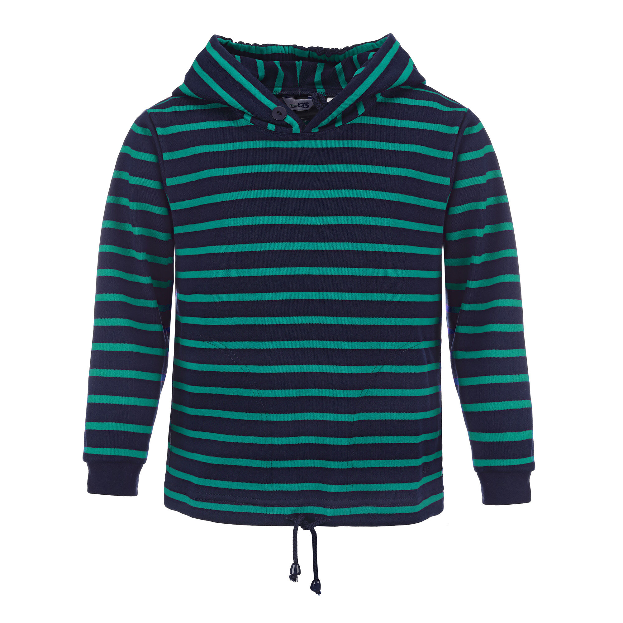 - bis Gr. 140 ersetzt aus Sicherheitsgründen ein elastischer Gummizug und ein Knopf mit Schlaufe den Kordelzug in der Kapuze. (225 g/m²)