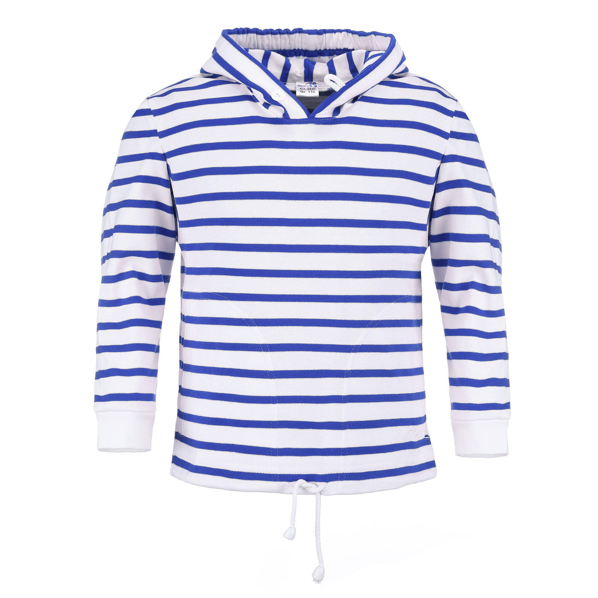 - bis Gr. 140 ersetzt aus Sicherheitsgründen ein elastischer Gummizug und ein Knopf mit Schlaufe den Kordelzug in der Kapuze. (225 g/m²)