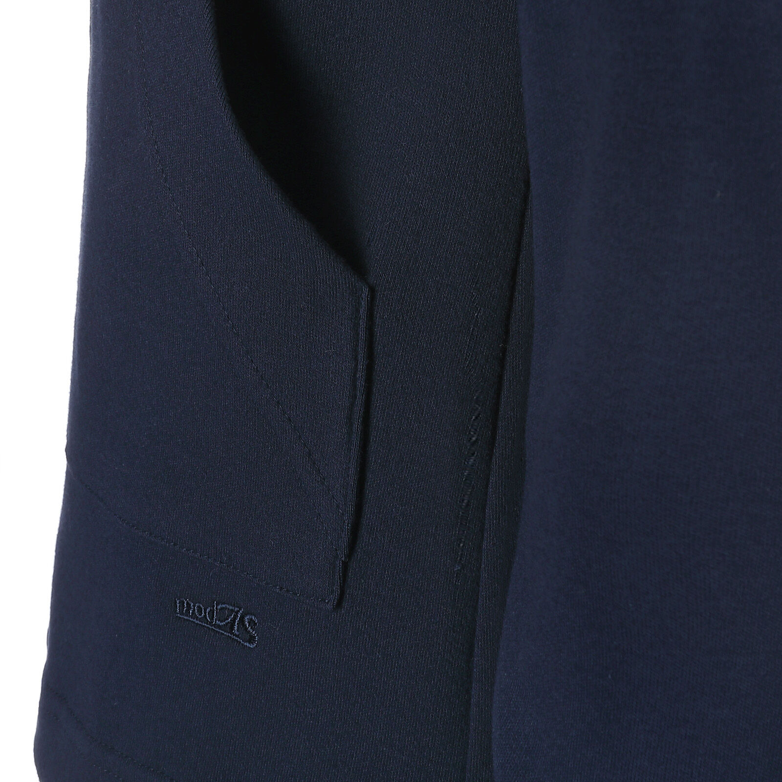 unifarbene Jacke mit Kapuze unterer Saumabschluss und Kapuze mit Kordelzug zwei aufgesetzte Taschen Ärmelbündchen durchgehender Reißverschluss Kapuze innen und Blende im Frontbereich gestreift abgesetzt aus 100% elastisch gewirkter Baumwolle. (ca. 225 g/m²)