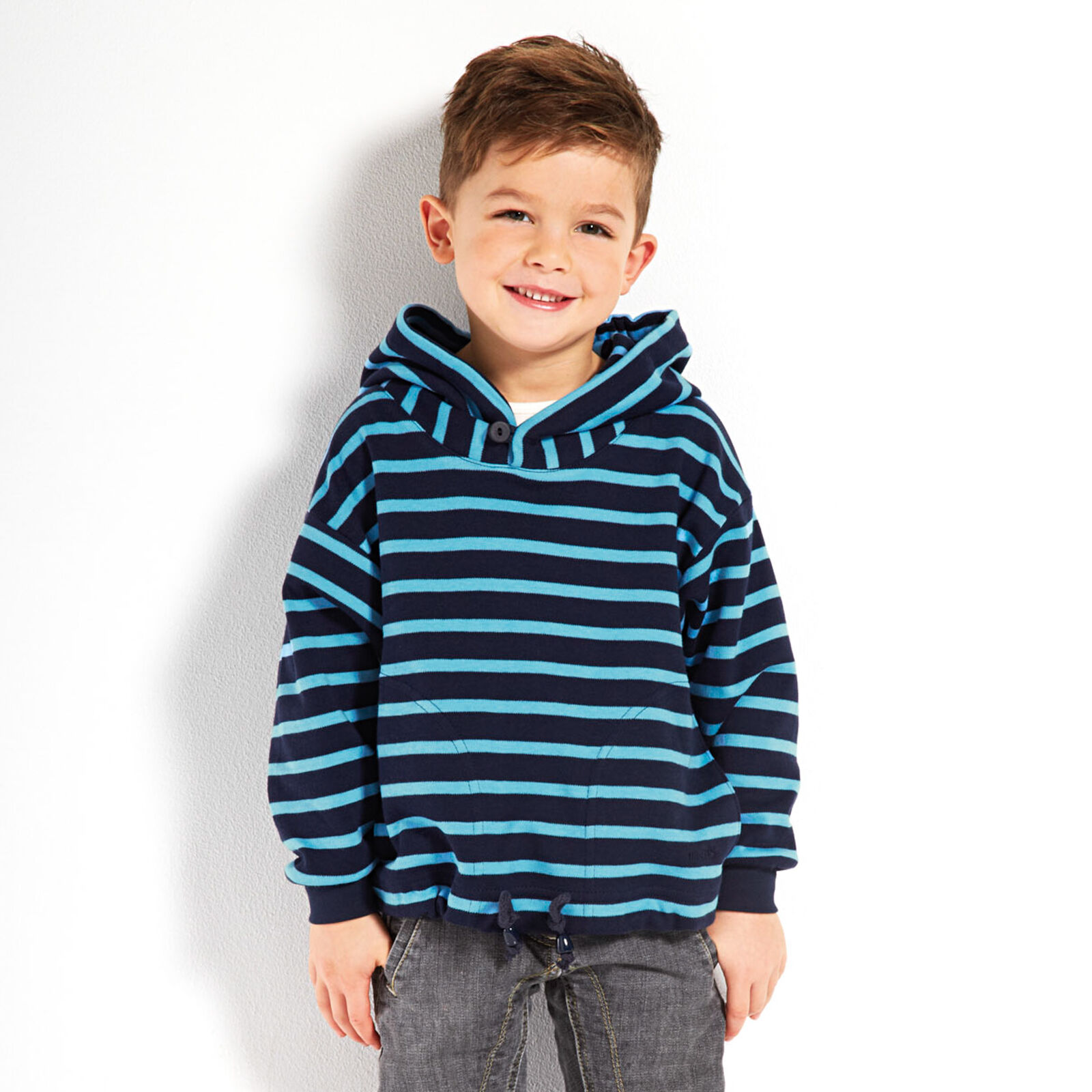 das perfekte Outfit für den Tag am Meer Kapuzenshirt wie Abbildung in unifarben bequem und lässig geschnitten aus 100% elastisch gewirkter Baumwolle die doppellagige Kapuze und der Bundabschluss sind durch einen Kordelzug verstellbar bis Gr. 140 ersetzt aus Sicherheitsgründen ein elastischer Gummizug und ein Knopf mit Schlaufe den Kordelzug in der Kapuze