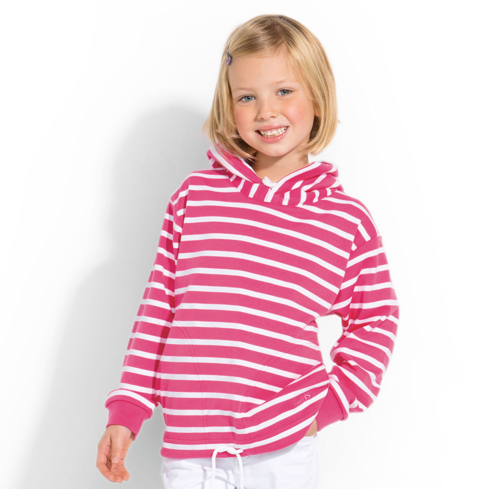 • bis Gr. 140 ersetzt aus Sicherheitsgründen ein elastischer Gummizug und ein Knopf mit Schlaufe den Kordelzug in der Kapuze. (225 g/m²)