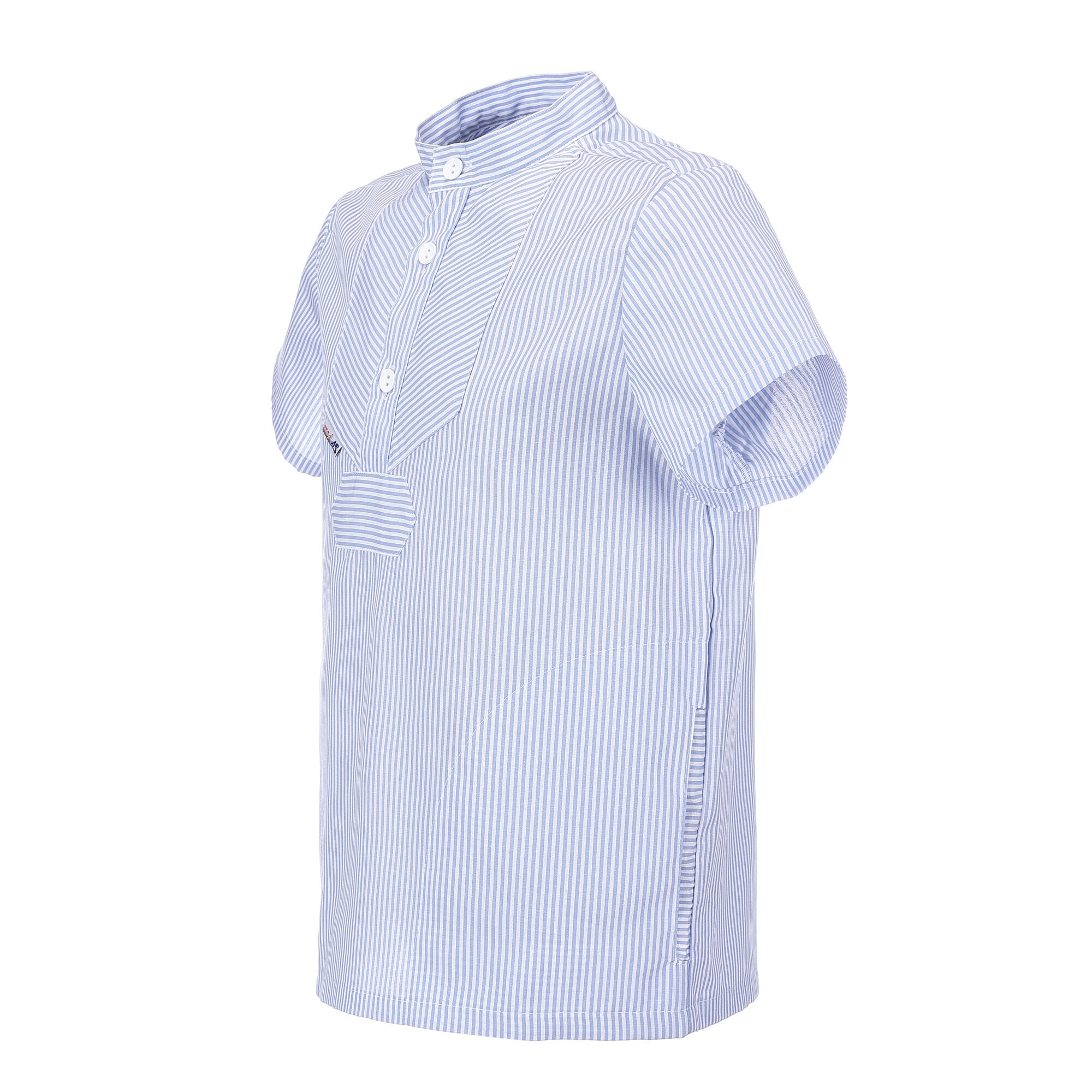 im traditionellen Finkenwerder-Stil, halbe Knopfleiste, Ärmelbündchen, Stehkragen, buntgewebte pflegeleichte Baumwollmischung, 80% Baumwolle / 20% Polyester. (ca. 115 g/m²)