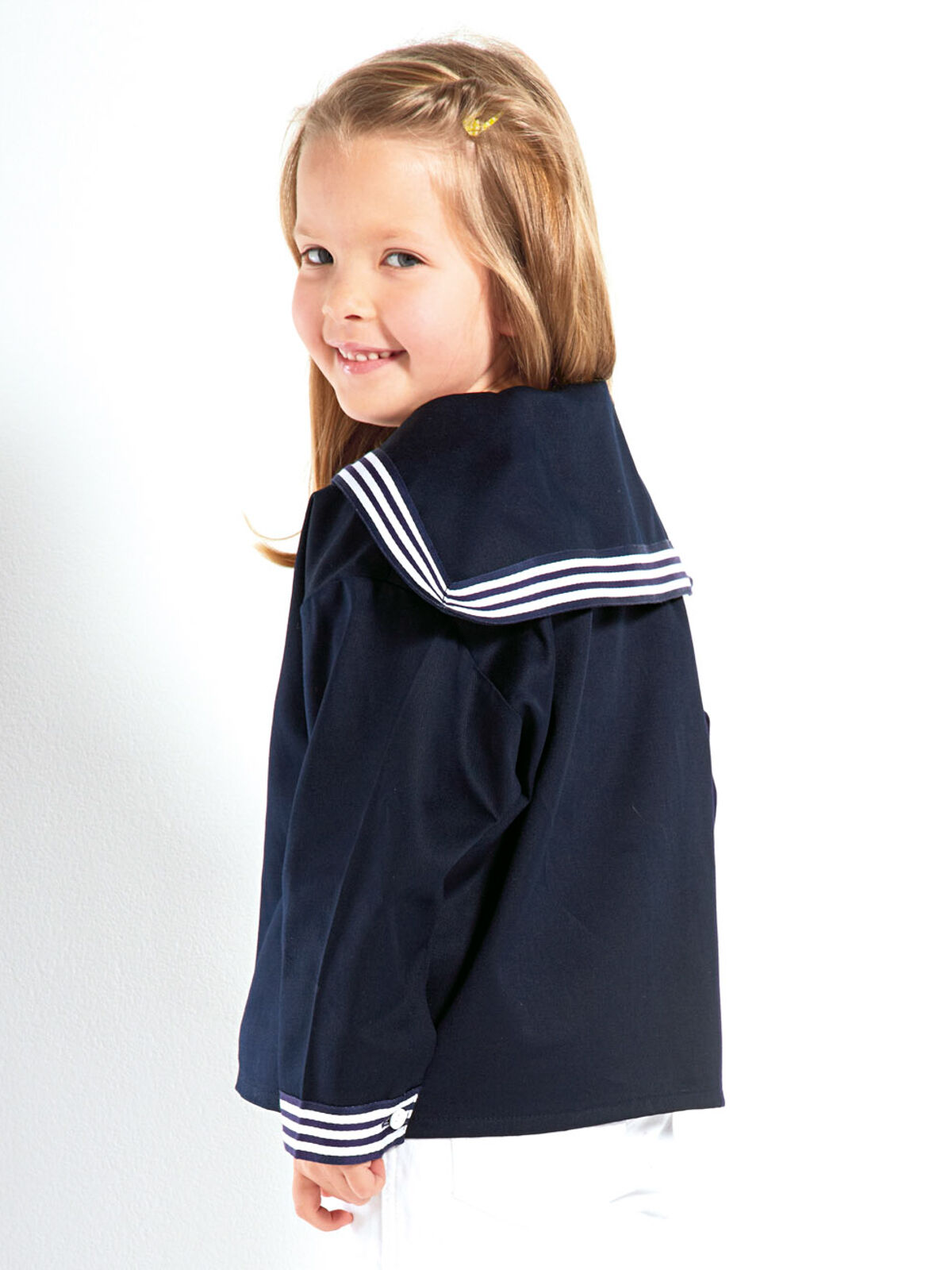 hochwertig verarbeitetes Kleid im Matrosen-Stil mit Kragen rote Satinschleife, vorne geköpft 100% Baumwolle (ca. 190 g/m²)