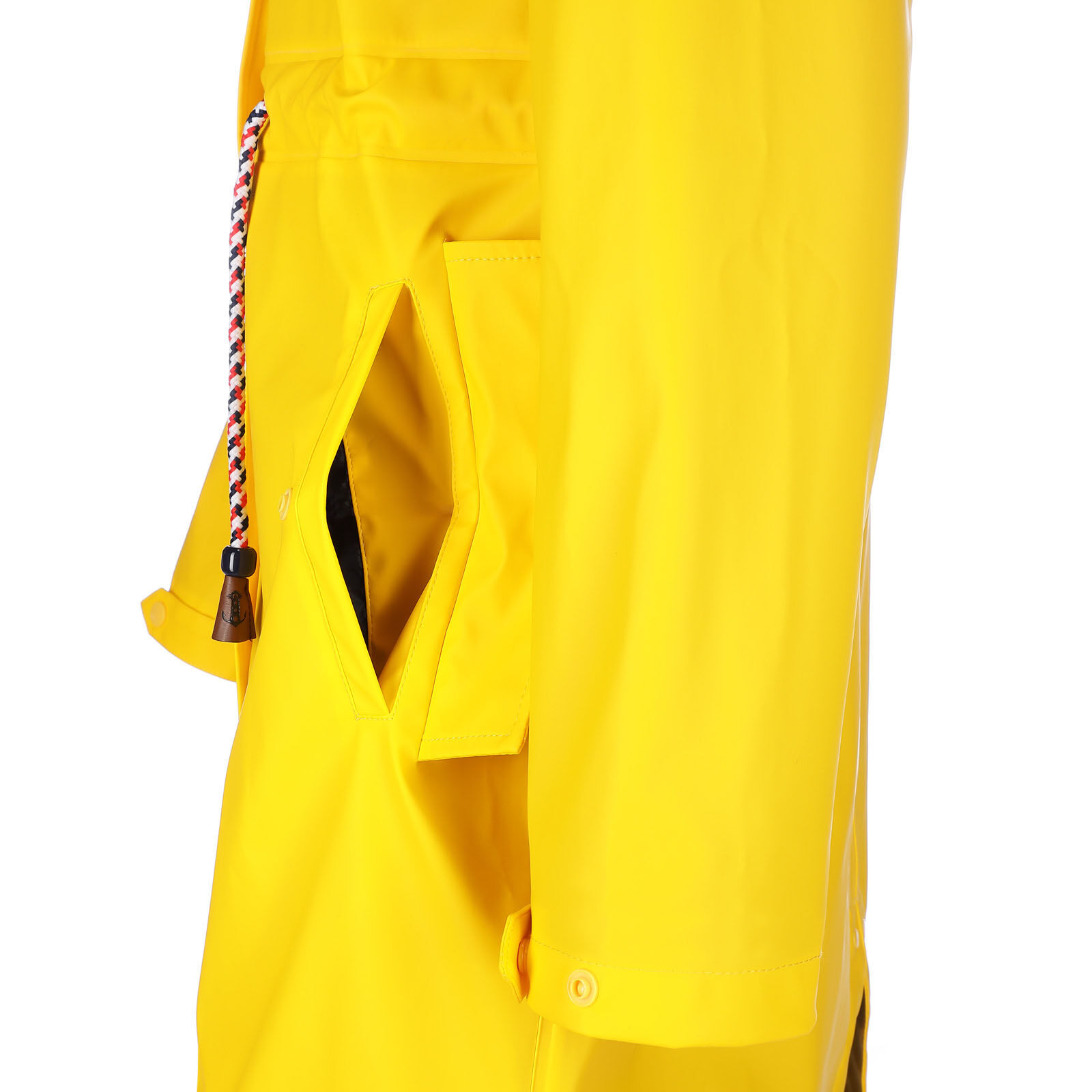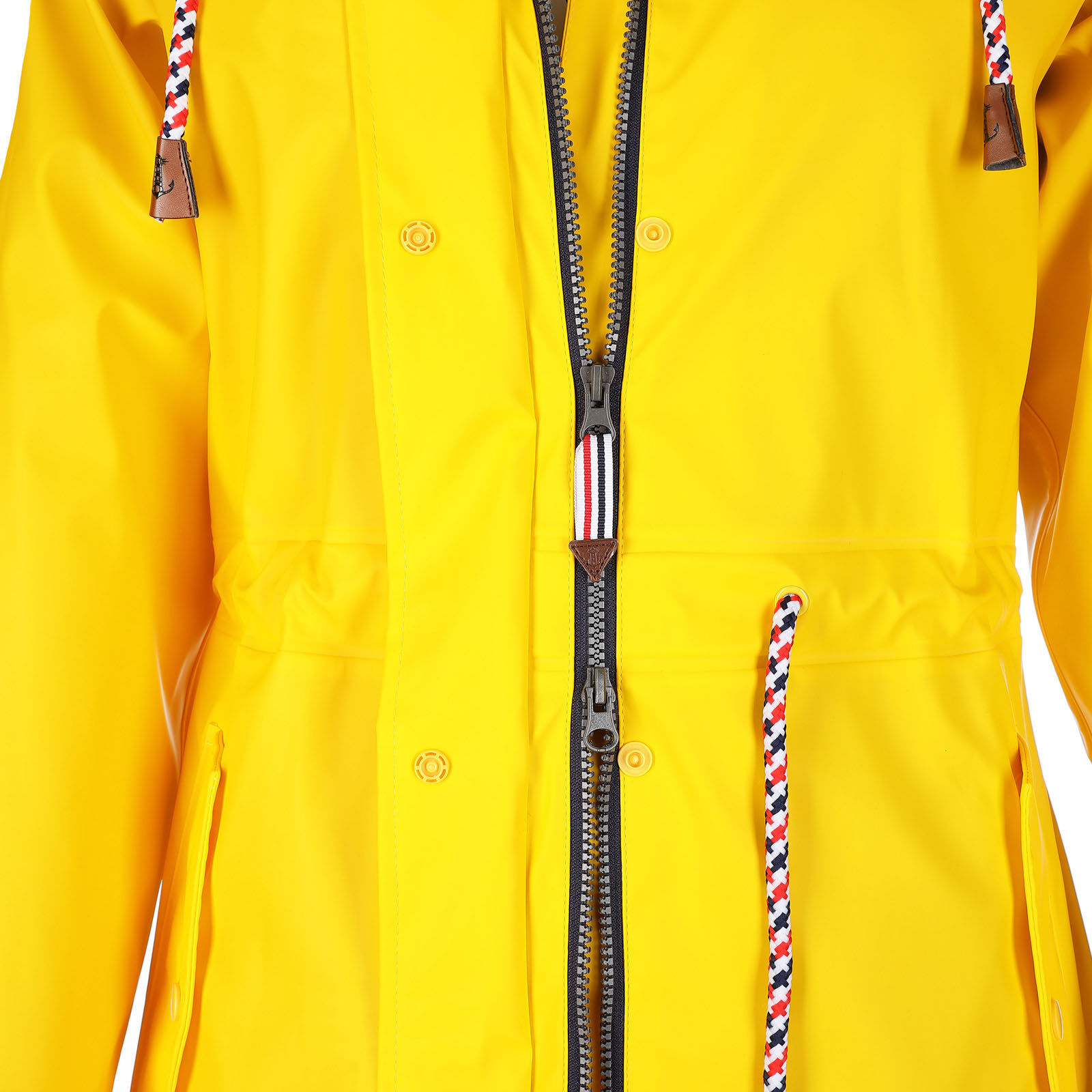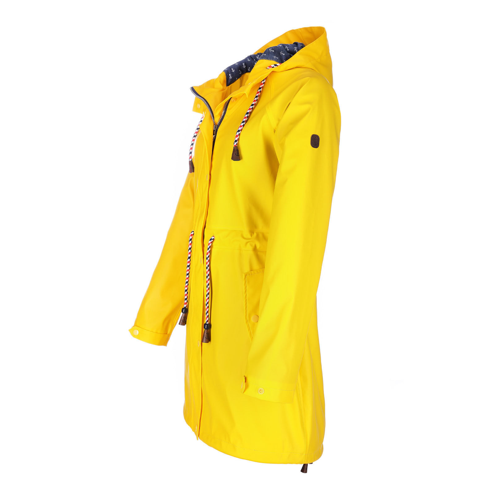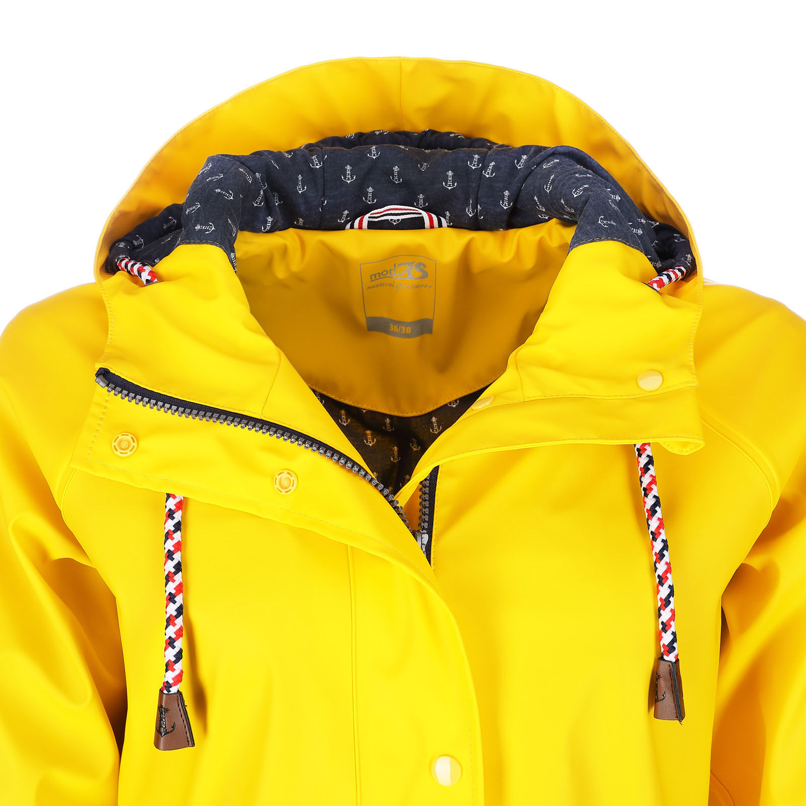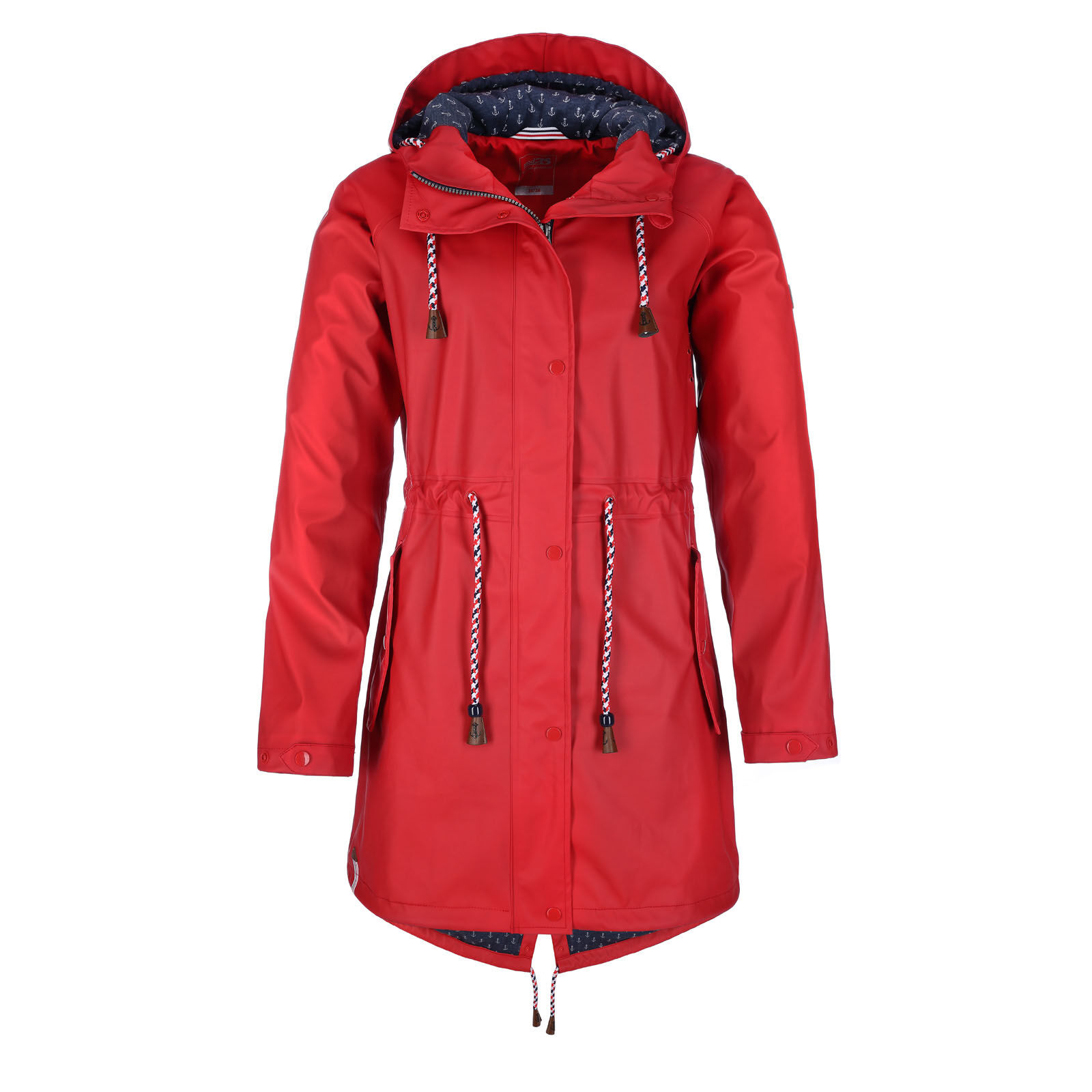 leicht tailliert mit Kordelzug zwei Seitentaschen mit Patte Zweiwege-Reißverschluss Druckknopfleiste Ärmelabschlüsse in der Weite verstellbar Kapuze mit Kordelzug mit verschweißten Nähten wasserdicht Wassersäule 3000 mm angerauhtes Baumwollinnenfutter mit maritimen Druck 100% Polyester mit 100% Polyurethan-Beschichtung Futter: 100% Baumwolle mit Ärmelfutter aus 100% Polyester