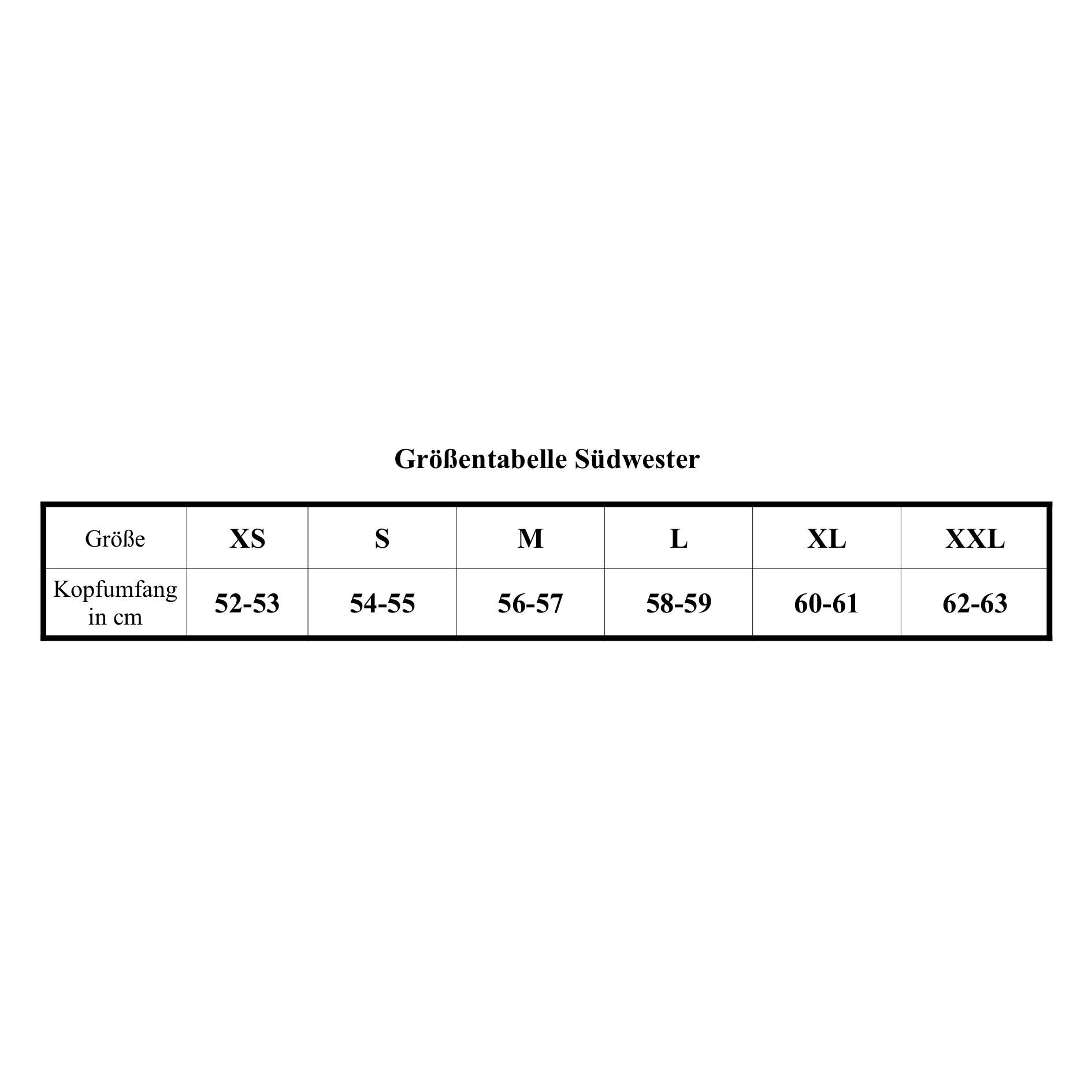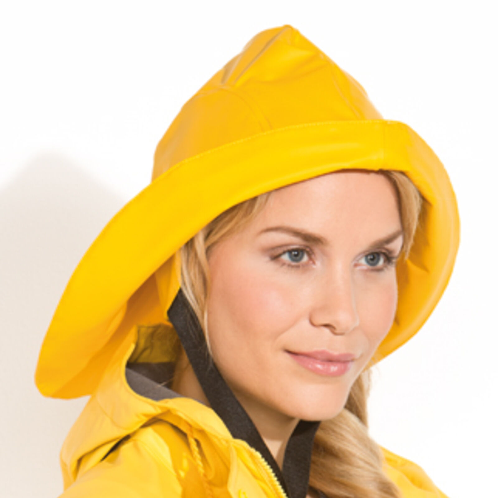 100% wasserdicht verschweißte Nähte innen gefüttert mit extra großer Krempe für optimalen Wetterschutz und Sturmband mit verstellbarem Stopper aus 100% PVC.